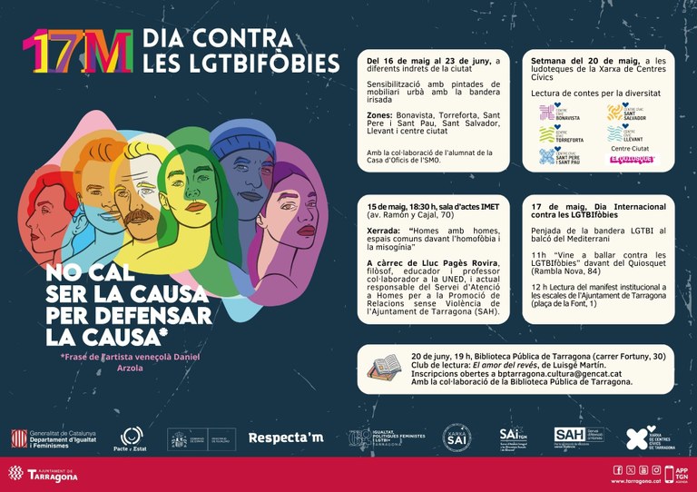 Els actes principals tindran lloc aquest divendres 17 de maig amb la penjada de la bandera LGTBI al Balcó del Mediterrani, l'esdeveniment Vine a ballar contra les LGTBIfòbies que se celebrarà a les 11 h davant del Quiosquet (Rambla Nova, 84) i la lectura del manifest institucional a les escales de l'Ajuntament de Tarragona a les 12 h.