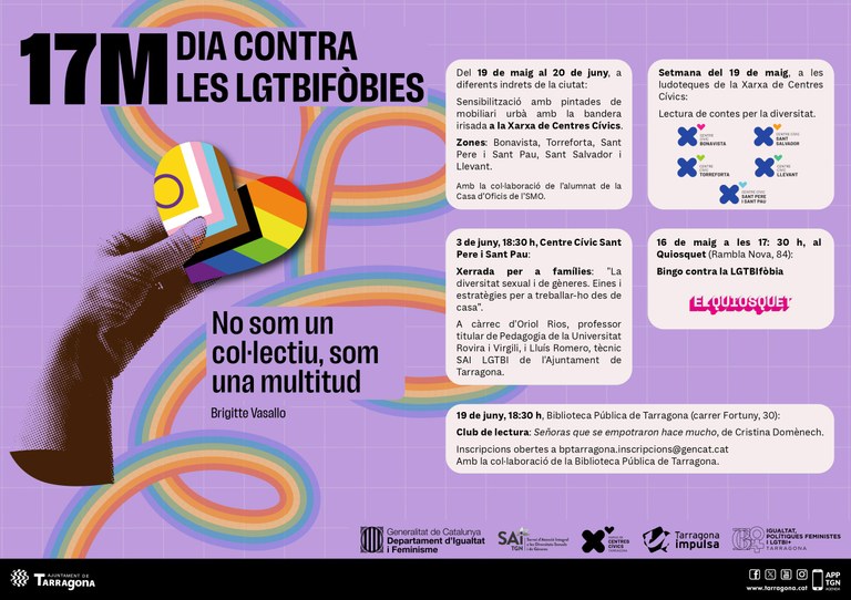 Amb motiu del Dia Internacional contra l'LGTBI-fòbia que se celebra cada 17 de maig, la conselleria d'Igualtat, Feminismes i LGTBI+ de l'Ajuntament de Tarragona intensifica les accions per fer una crida a la ciutadania per combatre l'odi envers les diversitats sexuals i de gènere. Des de demà 16 de maig i fins a finals de juny, es duran a terme diferents activitats de sensibilització que, sota al lema No som un col·lectiu, som una multitud, consistiran a fer visibles els colors de la bandera irisada en l'espai públic i es duran a terme jocs, xerrades i lectures obertes a tota la ciutadania per conscienciar sobre aquesta realitat.