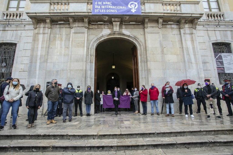 Representants dels diferents grups municipals llegeixen el manifest institucional del Dia de la Dona a la porta de l’Ajuntament de Tarragona