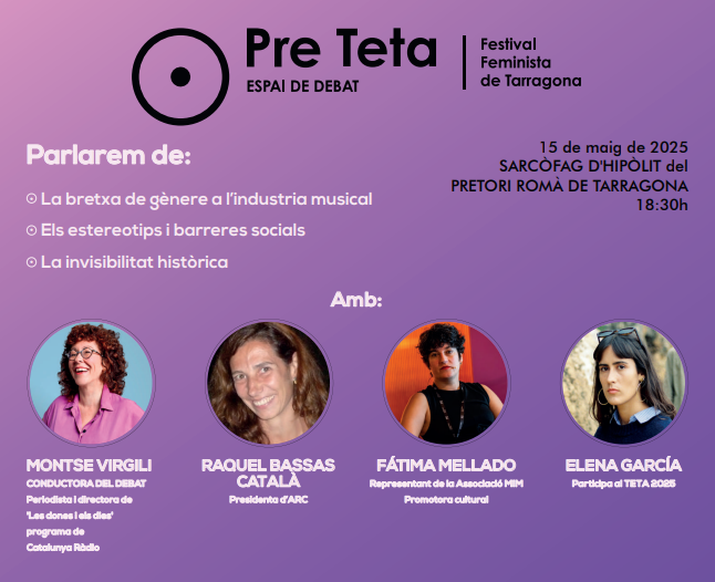 Demà dijous 15 de maig a les 18.30 hores tindrà lloc la segona jornada Pre TETA, que se celebrarà a la sala del sarcòfag d'Hipòlit ubicada al Pretori amb motiu de Tarraco25 i serà un debat sobre feminisme i música que se celebrarà sota el títol Sense les veus de les dones, la banda sonora de la nostra història estarà incompleta. És hora d'escoltar totes les veus.