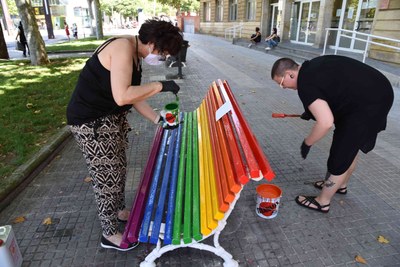 25/06/2020 - Aquest dijous s'han pintat els bancs de plaça Imperial Tàrraco amb els colors de l'arc de Sant Martí