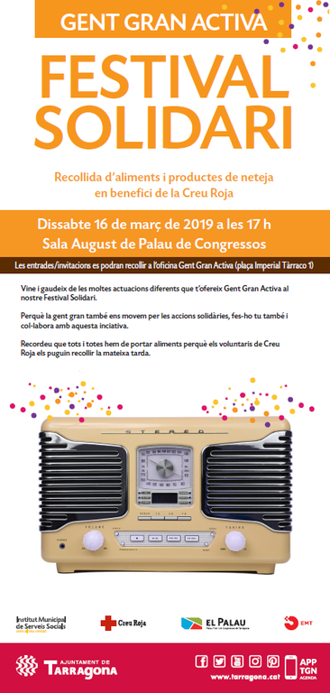 Dissabte 16 de març, a les 17 hores, se celebrarà el V Festival Solidari de Gent Gran Activa a la Sala August del Palau de Congressos. Hi haurà actuacions dels grups de ball i cant vinculats a les llars municipals de gent gran, i ja hi ha confirmades més de 20 actuacions: ball en línia, sevillanes, play-bacs, cant coral, teatre musical, o country. L’objectiu del Festival és col·laborar a omplir el magatzem d’aliments i productes de neteja de Creu Roja.