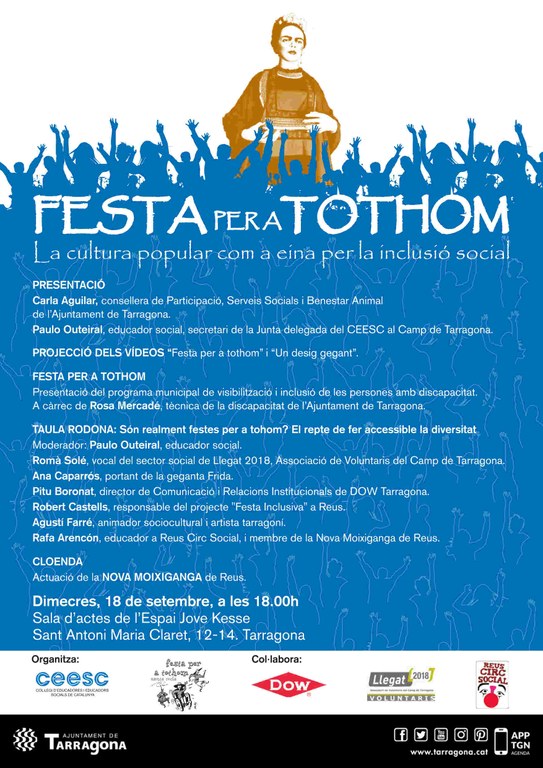 Dimecres, 18 de setembre, a les 18 h, a l’Espai Jove Kesse, de la mà del Col·legi d’Educadors Socials de Catalunya i de la Conselleria de Serveis Socials, Feminisme i LGTBQ+ de l’Ajuntament de Tarragona, es parlarà en una taula rodona com la participació en la vida cultural del país, de la ciutat o del poble pot esdevenir una eina per a la inclusió dels col·lectius que es troben en situacions de desigualtat, fragilitat o exclusió.