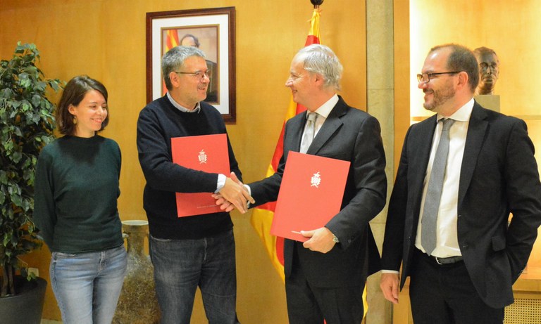 L'alcalde de Tarragona, Pau Ricomà, acompanyat de la consellera de Serveis Socials, Carla Aguilar-Cunill, i el director de Banca d'Institucions de CaixaBank a Catalunya, Joaquim Macià, han signat un conveni amb la Fundació Bancària La Caixa per garantir el programa social d'àpats infantils a través del programa 'Dinem a l'escola'.