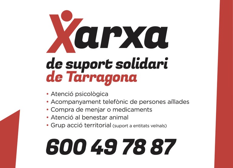 El telèfon de la Xarxa Solidària de Suport és 600 497 887 i atén al públic de dilluns a divendres, de 8 a 20 h, i dissabtes, de 9 a 13 h i de 16 a 18 h.
