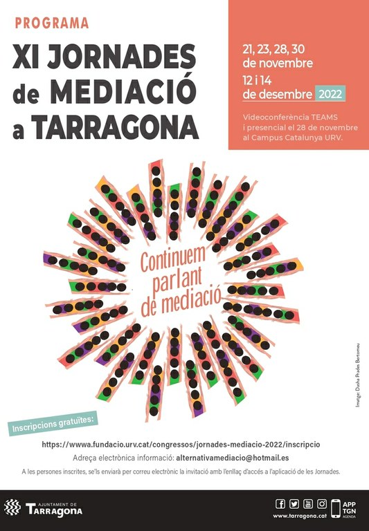 El 21 de novembre arranquen les XI Jornades de Mediació a Tarragona, coorganitzades per l’Institut Municipal d’Educació de Tarragona (IMET), l’Institut Municipal de Serveis Socials de Tarragona (IMSST) i altres entitats com la URV, UOC i l’Associació de Professionals de la Mediació, així com diferents col·legis professionals amb seu o delegació a Tarragona com el COPEC, ICAT, COPC, TSCAT, CEESC i CAFT contant i amb la col·laboració del Centre de Mediació i ADR de la Generalitat (departament de Justícia) i el Departament d’Educació de la Generalitat, que homologuen aquesta formació per professionals de la mediació i de l’educació. Aquestes jornades, de les quals se celebra l’onzena edició, promouen el diàleg entre les persones i grups socials com a eina de gestió de les discrepàncies i conflictes.