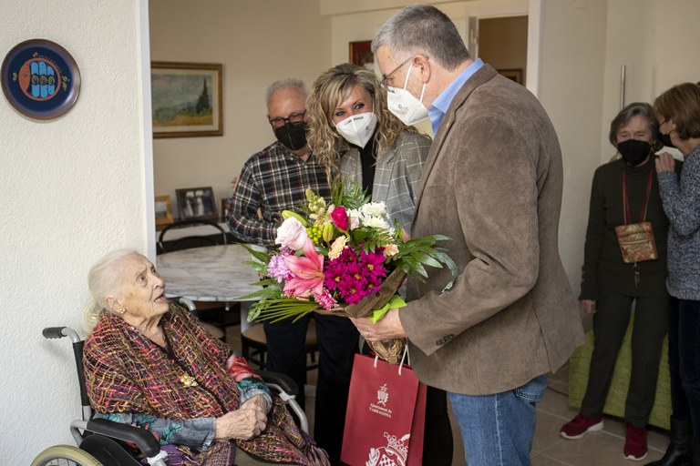 L’alcalde de Tarragona, Pau Ricomà, i la consellera de Gent Gran, Maria José López, han felicitat aquesta tarda a l’àvia centenària Carme Martí Lloveras.
