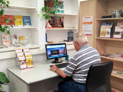 Dona suport i facilitar la recerca d’informació que només es troba a internet. A l’oficina hi ha un ordinador a disposició de les persones grans: elles mateixes poden buscar la informació que necessitin.