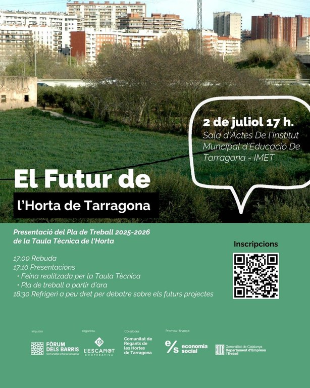La sessió de retorn clou el primer cicle de treball de la Taula Tècnica de l’Horta de Tarragona, un espai participatiu per reflexionar sobre el futur de les Hortes i el seu encaix territorial, ambiental i productiu. Durant la trobada es presentaran les propostes sorgides dels grups de treball i les línies de treball per als propers mesos, obrint espai al debat i a la incorporació de nous agents. L’acte comptarà amb una un refrigeri final per afavorir el contacte i la conversa informal al voltant de les idees de projecte pels propers mesos.