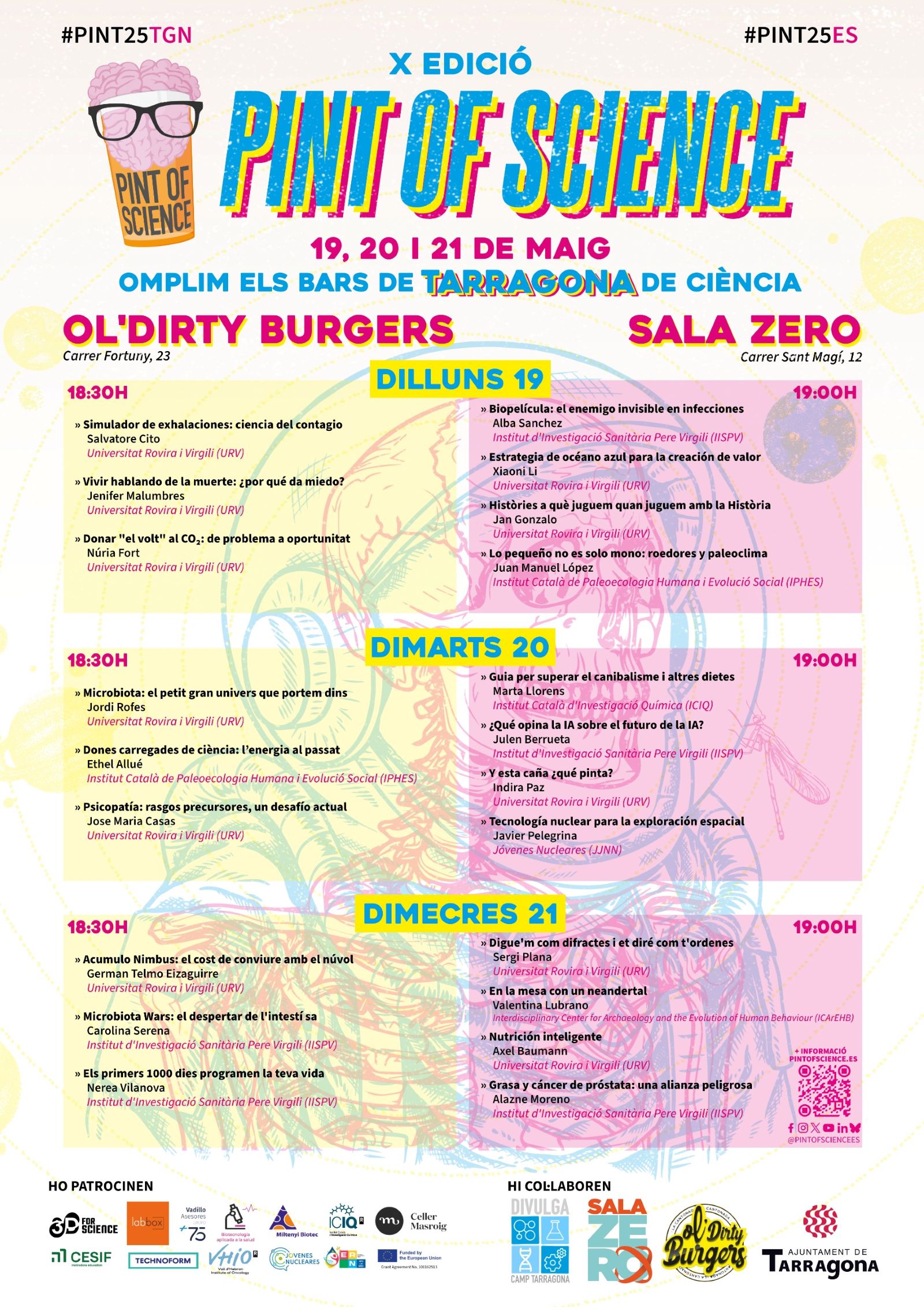 Torna el festival de divulgació científica Pint of Science a Tarragona! Els propers 19, 20 i 21 de maig, més d’una vintena d’investigadores i investigadors de la Universitat Rovira i Virgili i institucions i centres de recerca del territori aproparan la seva ciència als ciutadans i ciutadanes a l’Ol’Dirty Burgers, a partir de les 18:00 hores, i a la Sala Zero, a partir de les 19:00 hores.