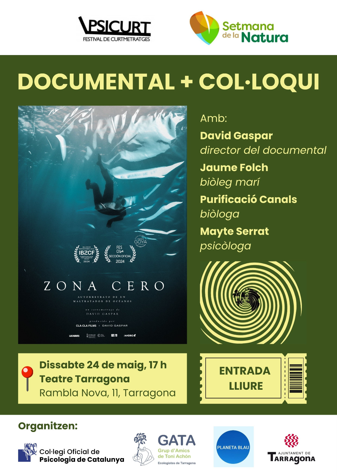 Projecció del documental "Zona zero" i porterior col·loqui, amb la presència del director del documentat David Gaspar, el biòleg marí Jaume Folch, la biòloga Purificació Canals i la psicòloga Mayte Serrat.