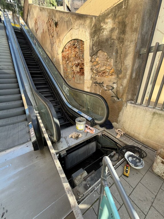 Comencen els treballs de substitució de la cadena d'un tram d'escales mecàniques del carrer Vapor