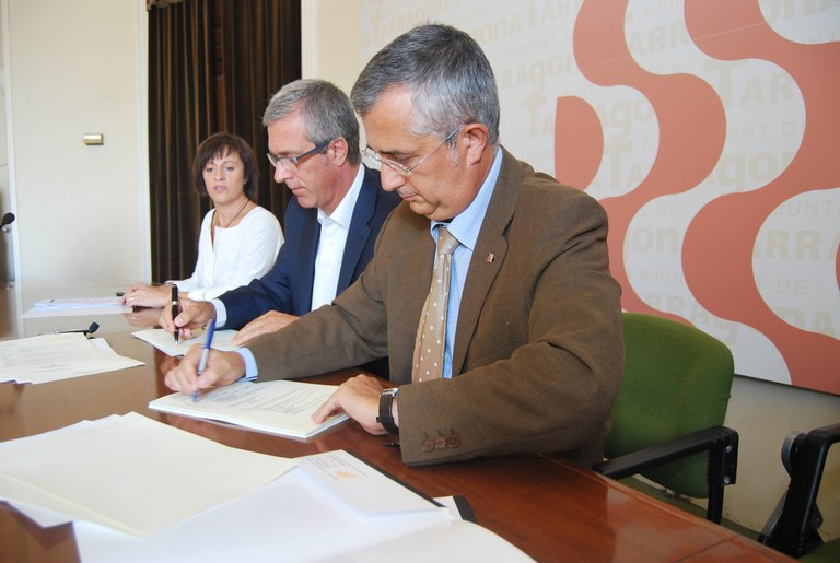 L’alcalde de Tarragona, Josep Fèlix Ballesteros i el director territorial del Departament d’Acció Social i Ciutadania de la Generalitat, Jordi Tous; juntament amb la tinent d’alcalde de l’Àrea de Serveis a la Persona, Victòria Pelegrín, han signat aquest matí el Contracte Programa 2009 que aquest departament de la Generalitat estant presentant aquests dies per diferents Ajuntaments i Consells Comarcals de Catalunya.