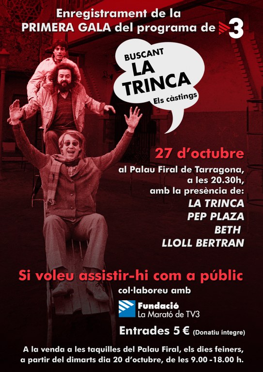 El proper dimarts dia 27 d’octubre, a les 20.30 h, tindrà lloc al Palau Firal de Tarragona l’enregistrament de la primera gala del programa de TV3 Buscant la Trinca.