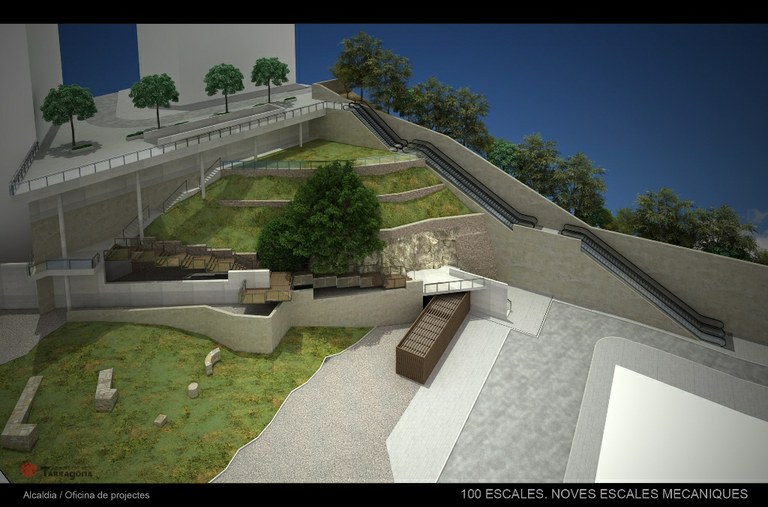 Per a la recepció de les escales es crearà una plataforma que amplia l’àmbit del carrer Zamenhoff, creant un mirador sobre la Part Baixa de la ciutat.