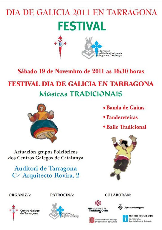 Aquest dissabte 19 de novembre, a les 16.30 hores, l’Auditori Eutyches d'El Palau Firal i de Congressos serà l’escenari del Festival del Dia de Galicia a Tarragona, organitzat pel Centro Galego de Tarragona i la Federación de Entidades Culturais Galegas en Catalunya.