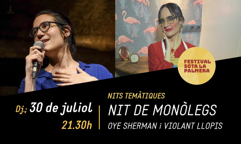 Aquest dijous 30 de juliol estava previst l’actuació de la periodista Ana Polo dins la Nit de Monòlegs i Humor de la programació del Festival Sota La Palmera, però per motius personals s’ha hagut de suspendre i la substituirà l’artista Violant Llopis. Es manté, però l’actuació de Oye Sherman, també dijous a la nit.