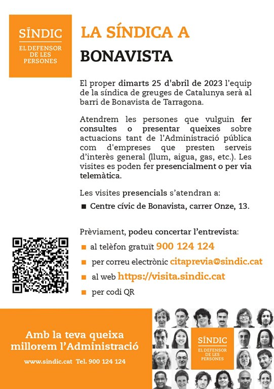 Dimarts 25 d’abril, l’equip de la síndica de greuges de Catalunya serà al barri de Bonavista de Tarragona. S’atendran consultes i queixes sobre actuacions tant de l’administració pública com d’empreses que presten serveis d’interès general (llum, aigua, gas, etc.). Les visites es poden fer presencialment al Centre Cívic de Bonavista o per via telemàtica.