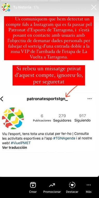 Aquest dissabte al migdia el Patronat Municipal d'Esports de Tarragona (PMET) ha detectat un compte fals a Instagram que, identificat com a @patronatesportstgn_, es fa passar pel compte oficial del PMET, @patronatesportstgn. El compte fals, que té un perfil en privat, es posa en contacte amb els usuaris, els comunica que han guanyat el sorteig a la zona VIP de La Vuelta a Tarragona i els adreça a una pàgina on els demana dades bancàries.