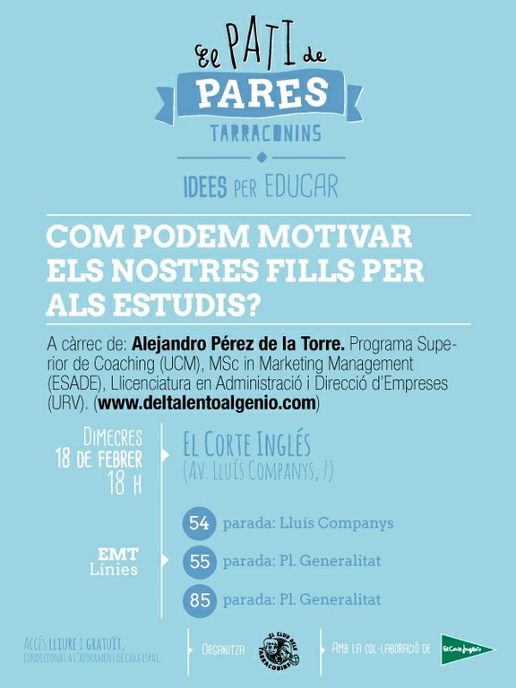 El dimecres 18 a les 18 hores, a El Corte Inglés, la xerrada Com podem motivar els nostres fills per als estudis?, anirà a càrrec d'Alejandro Pérez de la Torre (www.deltalentoalgenio.com), llicenciat en Administració i Direcció d'Empreses, membre del Programa Superior de Coaching (UCM) i del MSc in Marketing Management (ESADE).
