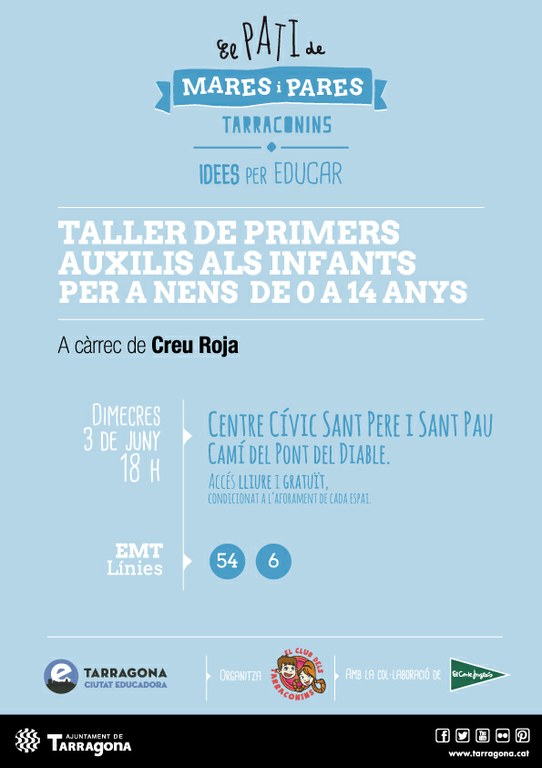 Demà dimecres 3 de juny, a les 18 hores, al Centre Cívic de Sant Pere i Sant Pau hi haurà la propera xerrada de Pati de Mares i Pares Tarraconins, dins el cicle “Idees per educar”, amb el "Taller de primers auxilis als infants per a nens de 0 a 14 anys”, a càrrec de la Creu Roja.