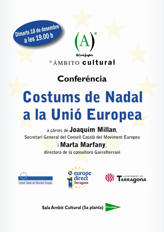 El proper dia 18 de desembre a les 7 de la tarda, tindrà lloc la sala Àmbit Cultural d'El Corte Inglés de Tarragona, la xerrada Costums de Nadal a la Unió Europea, a càrrec de Joaquim Millan, Secretari General del Consell Català del Moviment Europeu i Marta Marfany, directora de Garrafterrani.
