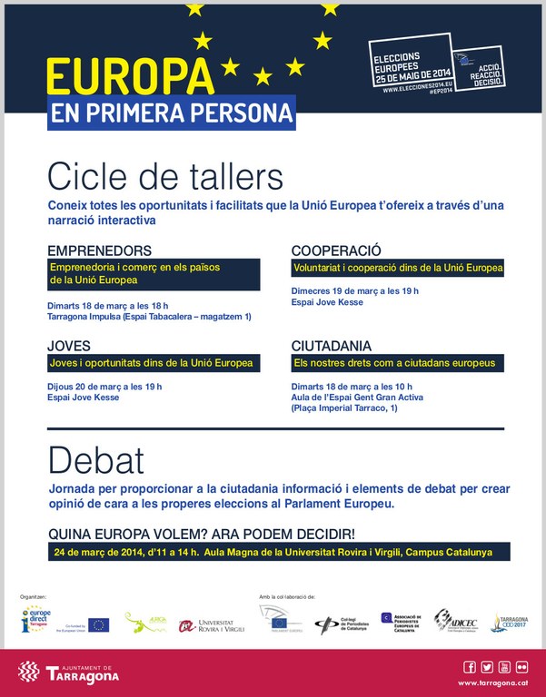 El centre Europe Direct Tarragona ha organitzat un cicle de tallers per donar a conèixer la importància del Parlament Europeu i, en conseqüència, de participar en aquestes eleccions. A més, es farà un debat a la URV el dilluns dia 24 de març per tractar del paper del Parlament Europeu des del punt de vista d’un ex President, Enrique Barón, dues periodistes, Carme Colomina i Teresa Carreras, i un politòleg, Xavier Ferrer.