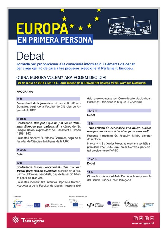 La jornada-debat s’iniciarà amb la conferència" Què pot i què no pot fer el Parlament Europeu pels ciutadans?", a càrrec de l’expresident del Parlament Europeu (1989-1992) Enrique Barón.