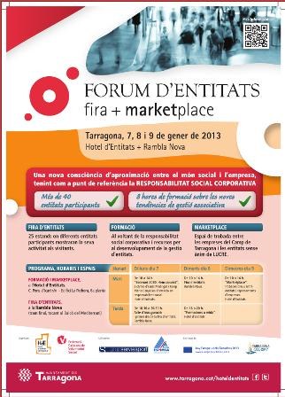 Els propers dies 7, 8 i 9 de gener de 2013 es celebrarà a Tarragona el 1r Fòrum d'Entitats, amb més de 35 associacions implicades. Aquest esdeveniment vol ser el punt de partida d’una nova manera d’enfocar la Responsabilitat Social Corporativa (RSC) per part de les entitats, les administracions i les empreses del Camp de Tarragona.