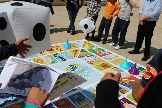 L’estrena s’ha celebrat al pati de l’escola i després d’una xerrada en la qual els alumnes han pogut repassar el temari treballat a classe des d’un vessant més lúdic. Amb un tauler i uns daus gegants, i contestant preguntes sobre els 28 països de la Unió, els seus símbols i aspectes geogràfics, socioeconòmics i polítics, els nens i nenes han anat avançant caselles posant a prova els seus coneixements. L’activitat ha acabat amb el desplegament de totes les banderes europees i la interpretació de l’Himne d’Europa, a més de la lectura d’un manifest amb motiu del Dia d’Europa 2016, elaborat pels mateixos alumnes.