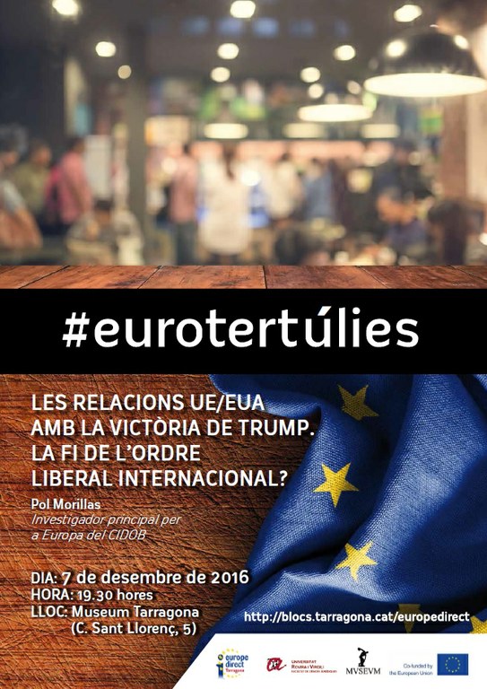 Les conseqüències de l'arribada de Donald Trump al govern dels Estats Units centraran l'última de les #eurotertúlies del 2016, que tindrà lloc aquest dimecres 7 de desembre. En concret, l'investigador del CIDOB Pol Morillas serà el convidat d'una sessió que porta per títol Les relacions UE/EUA amb la victòria de Trump. La fi de l'ordre liberal internacional?