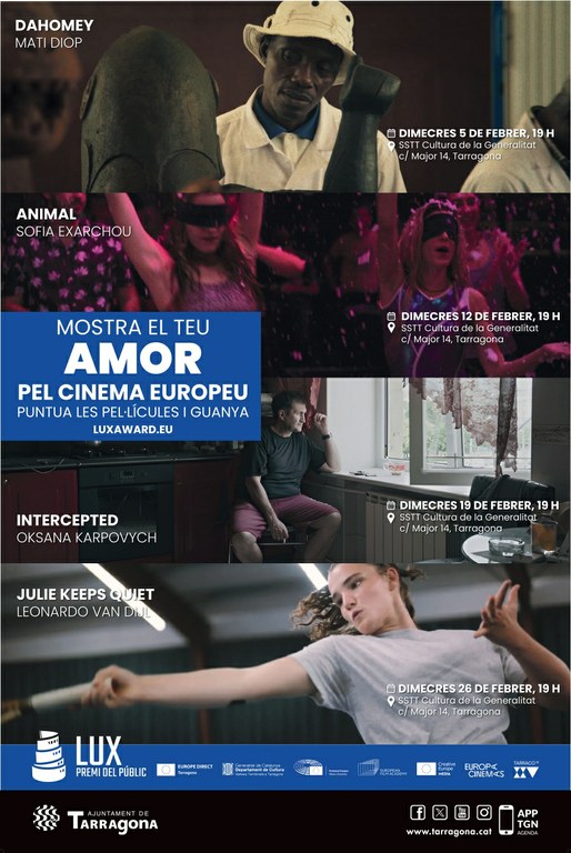 Les pel·lícules Animal, Dahomey, Intercepted i Julie Keeps Quiet, finalistes als premis Lux, es podran veure gratuïtament aquest mes de febrer a la sala d'actes dels Serveis Territorials de Cultura de la Generalitat de Catalunya, al carrer Major. Es tracta del cicle de cinema Premi del Públic Lux que torna a la ciutat de Tarragona per quart any consecutiu de la mà d'Europe Direct Tarragona, el punt d’informació i assessorament que l’Ajuntament de Tarragona té a disposició de la ciutadania tot allò que està relacionat amb la Unió Europea.