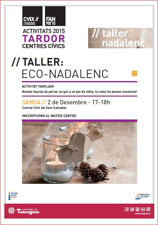 Des d’Europe Direct Tarragona volem contribuir a sensibilitzar sobre les estratègies de prevenció de residus, reutilització de productes i reciclatge i les polítiques de la Unió Europea i dels seus Estats membres en aquesta matèria, per això, hem organitzat un taller eco-nadalenc, al Centre Cívic de Sant Salvador, destinat a les famílies i on aprendrem a utilitzar allò que ja no ens fa servei per a la decoració nadalenca de les nostres llars.
