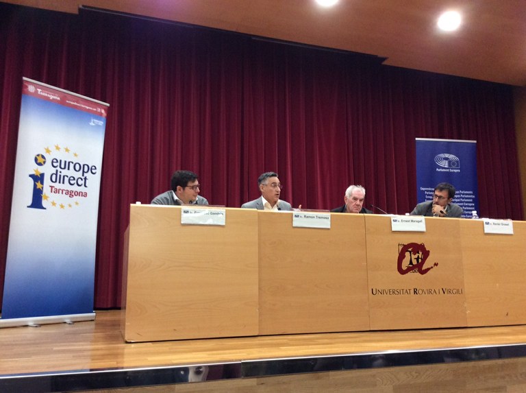 Tres eurodiputats catalans han participat a Tarragona en un col·loqui organitzat per l’Oficina Europe Direct i la facultat de Ciències Jurídiques de la Universitat Rovira i Virgili (URV) per donar a conèixer la Unió Europea i apropar els temes de l’actualitat europea a la ciutadania tarragonina. Francesc Gambús, eurodiputat del Partit Popular Europeu, Ramon Tremosa, de l’Aliança dels Demòcrates i Liberals per Europa, i Ernest Maragall, dels Verds/ALE, han abordat a l’Aula Magna de la Universitat totes les preguntes que els han fet des del públic, format majoritàriament per alumnes universitaris, i sense defugir els temes més controvertits de la política de la Unió, com la crisi dels refugiats de Síria.