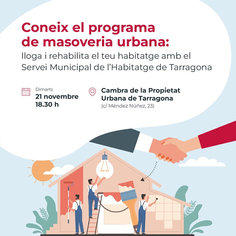El Servei Municipal d’Habitatge i Actuacions Urbanes de Tarragona (SMHAUSA) ha creat el programa de masoveria urbana que facilitarà l’accés a l’habitatge a col·lectius amb un baix nivell d’ingressos i, alhora, incentivar la sortida al mercat de lloguer d’habitatges sense rehabilitar incrementant el parc d’habitatges de la borsa de mediació per al lloguer social.
