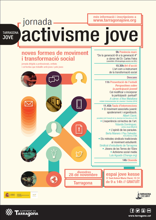 La jornada aplegarà també la presentació de l’estudi “Perspectives sobre la participació juvenil” proposat per Anna Matallana, diplomada amb el màster interuniversitari Joventut i Societat. L'acompanyaran diferents manifestacions i tipologies d'activisme joves des dels camps de l'educació en el lleure, l'art d’acció, els moviments estudiantils, l'associacionisme juvenil i les iniciatives social media amb representants del col·lectiu change.org.