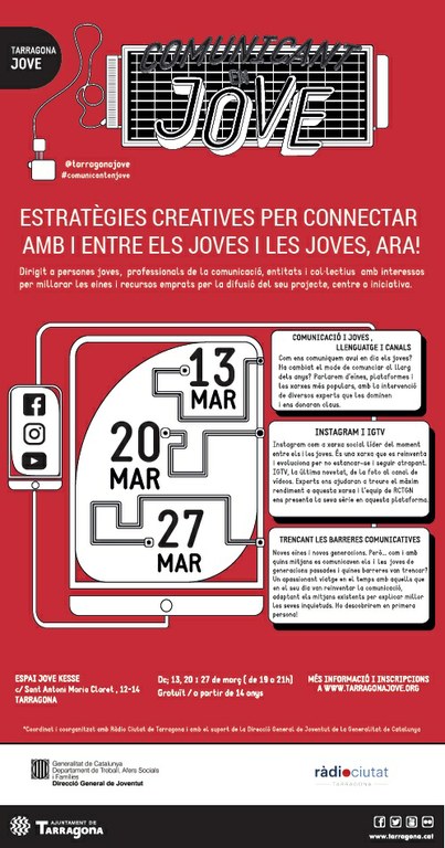 La proposta, d’entrada gratuïta amb inscripció prèvia, va dirigida a persones joves a partir de 14 anys, professionals de la comunicació, entitats i col·lectius amb interessos per millorar les eines i recursos emprats per a la difusió del seu projecte, centre o iniciativa.
