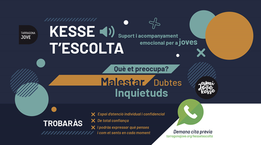 Recordem que segueix actiu el servei de suport i acompanyament emocional per a joves: Kesse T'escolta, espai d'atenció individual i confidencial per resoldre malestars, dubtes, inquietuds.. amb total confiança i poder expressar el que es pensa i es sent en cada moment. El servei està adreçat a les persones joves de 12 a 20 anys i es pot demanar cita prèvia a través de whatsapp. Podeu consultar tota la informació del servei a tarragonajove.org/kessetescolta.