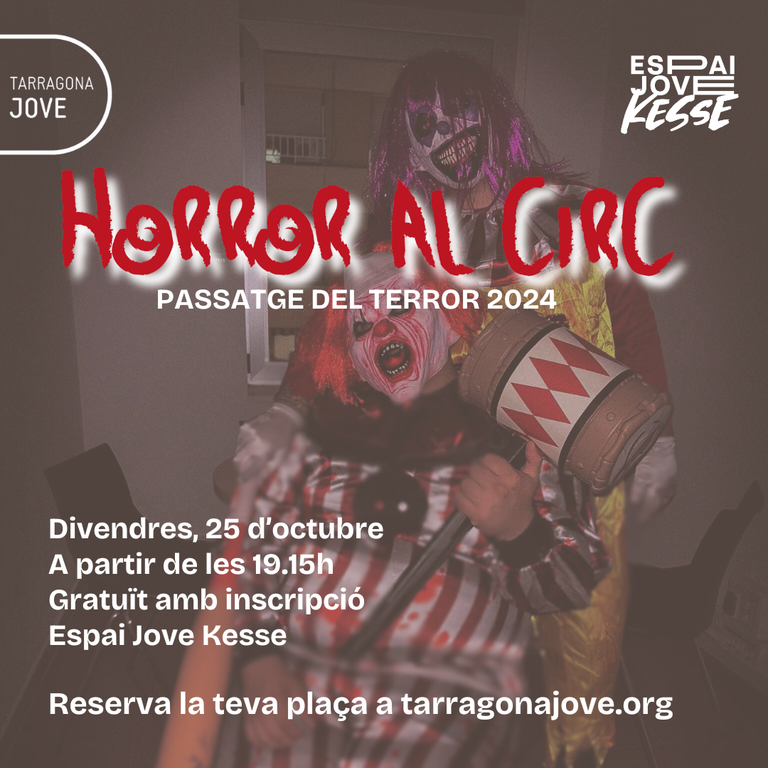Aquest divendres, 25 d'octubre, a partir de les 19.15 h, l’Espai Jove Kesse es convertirà en un autèntic escenari de por amb el passatge del terror ‘Horror al Circ’, una activitat organitzada per un grup de 20 joves tarragonins que han estat al capdavant de tot el procés de creació i execució de l'esdeveniment amb la col·laboració del Servei Municipal de Joventut i el personal tècnic de l’Espai Jove Kesse.