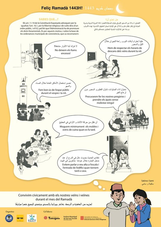 La Conselleria de Nova Ciutadania de l’Ajuntament de Tarragona desenvolupa aquests dies actuacions entorn el Ramadà, que se celebra fins el 2 de maig. Per una banda, facilita espais de domini públic per realitzar les oracions i garantir així el dret de culte. En segon terme, col·labora en la celebració comunitària de sopars populars. I finalment, es duu a terme una campanya comunicativa de sensibilització adreçada a tota la ciutadania per tal de conèixer millor què és i què significa el Ramadà per la comunitat islàmica de Tarragona amb l’objectiu de fomentar el respecte mutu i la convivència de tot el veïnat.
