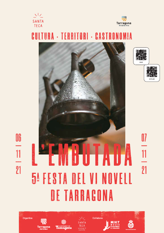 El Patronat Municipal de Turisme de Tarragona i l’Associació Santa Teca han unit forces per organitzar, el pròxim 6 i 7 de novembre, la cinquena edició de la Festa del vi novell de Tarragona, l’Embutada. Un esdeveniment que recupera una de les tradicions més esteses al segle XIX a la Part Alta de Tarragona, la de beure el vi novell, aquell acabat d’elaborar, amb un embut de llautó.