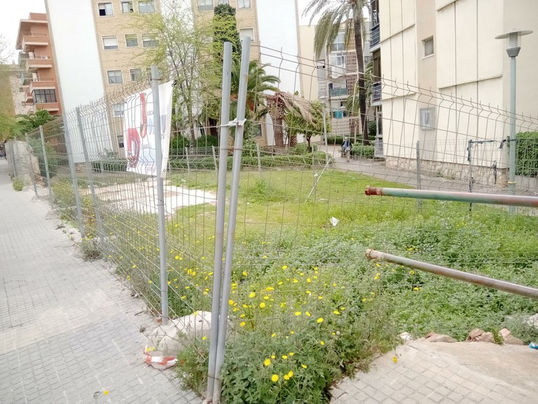 La parcel.la es troba situada al carrer Riu Glorieta número 10. Actualment aquest terreny es troba envoltat per tanca d’obra de 2 metres. Antigament l’ocupava un edifici que es va derruir i en l’actualitat queden algunes restes de murs i paviments. El projecte es centra en dos aspectes: dignificar l’espai actual i oferir un espai de reunió i esbarjo als veïns de la zona.
