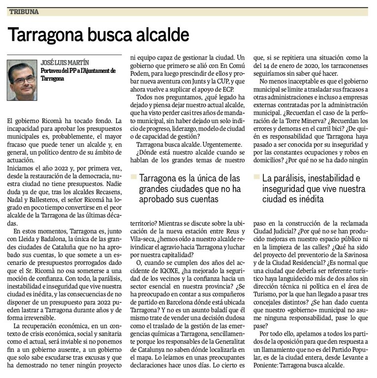 "El gobierno Ricomà ha tocado fondo. La incapacidad para aprobar los presupuestos municipales es, probablemente, el mayor fracaso que puede tener un alcalde y, en general, un político dentro de su ámbito de actuación".