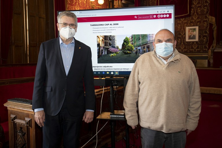 L’alcalde de Tarragona, Pau Ricomà, i el primer tinent d’alcalde de l’Ajuntament de Tarragona, Jordi Fortuny, han presentat aquest dijous el gruix dels projectes que s’estan treballant per obtenir fons europeus de recuperació, els Next Generation. Els serveis tècnics de les diferents conselleries del consistori, així com les empreses públiques i organismes autònoms fa mesos que elaboren els projectes, molts ja existents, i que aquestes convocatòries europees els aportaran una nova via de finançament. Així mateix, aquests projectes europeus també permetran impulsar-ne de nous, com l’ampliació de l’aparcament de Torroja o l’ampliació del dissuasiu del Cementiri. “El model de ciutat, sostenible i transformadora, impulsat per l’Ajuntament de Tarragona fa que molts dels projectes de mandat previstos encaixin en les línies estratègiques d’aquests fons europeus de recuperació econòmica”, subratlla l’alcalde de Tarragona, Pau Ricomà.