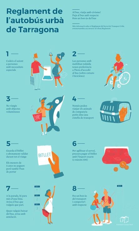 Els cartells que aniran a l'interior dels autobusos públics de Tarragona reuneixen les característiques d'un text de lectura fàcil, com són les imatges descriptives que harmonitzen amb l'explicació, línies que respecten les unitats sintàctiques del text, marges amples i interlineat generós o textos en bandera.