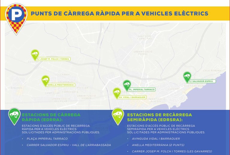 Les dues primeres estacions de recàrrega ràpida previstes s'instal·laran a la plaça Imperial Tàrraco i a la Vall de l'Arrabassada. Seran de 50 kW de potència amb sistema de pagament integrat. Aquest tipus de punts poden carregar 120 quilòmetres d'autonomia en menys de 30 minuts.