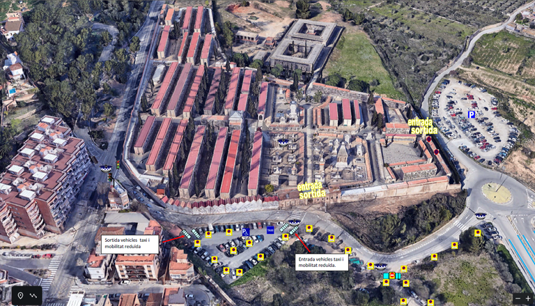 - L’estacionament de vehicles amb persones amb mobilitat reduïda i taxis es podrà fer a l’esplanada de davant la porta principal del cementiri i la sortida per la part més propera a la cruïlla amb Rovira i Virgili (veure plànol)