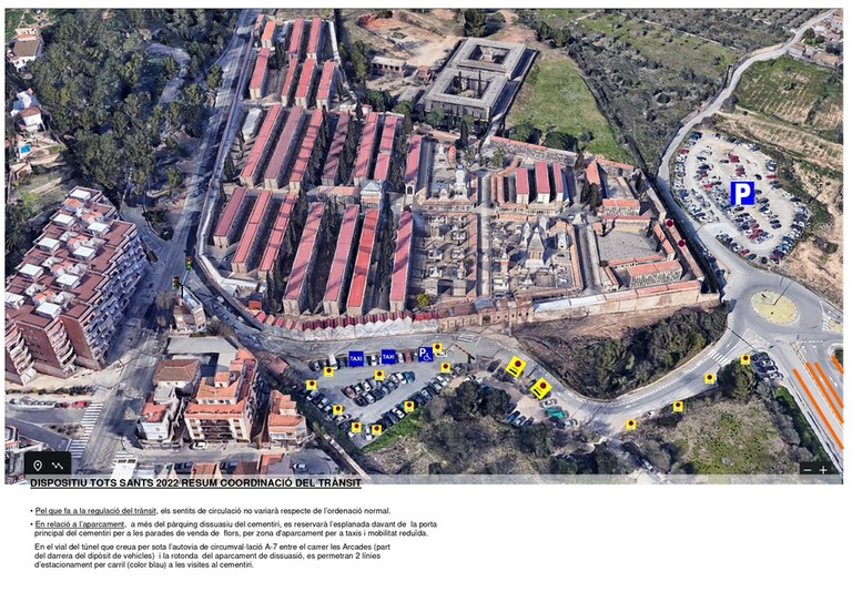 L’aparcament de vehicles davant del cementiri s’habilitarà enguany per a passatgers amb mobilitat reduïda, taxis i per descàrrega de persones d’edat avançada. El pàrquing dissuasiu estarà disponible i s’ampliarà amb les zones laterals més properes al cementiri, com altres anys. I a més enguany es comptarà amb l’increment d’aparcament amb la nova zona taronja del pas inferior de l’autovia.