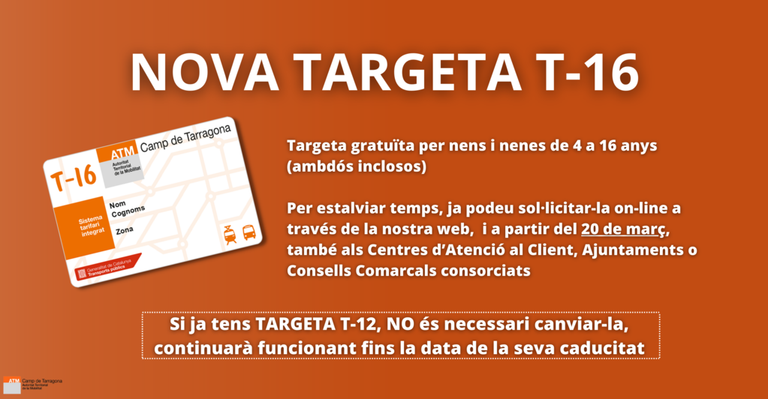 Aquells/es nens/es que ja tinguin la T-12 no cal que sol·licitin el nou títol, la T-12 continuarà funcionant fins a la seva data de caducitat. En la finalització de la T-12 podran sol·licitar la T-16.