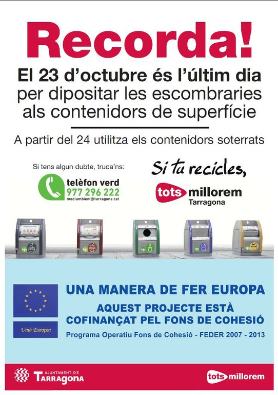 Si teniu algun dubte relacionat amb aquesta millora, pot trucar al telèfon verd 977 296 222, o bé per escrit al correu electrònic: mediambient@tarragona.cat.